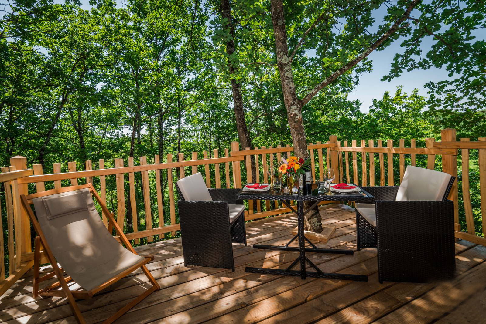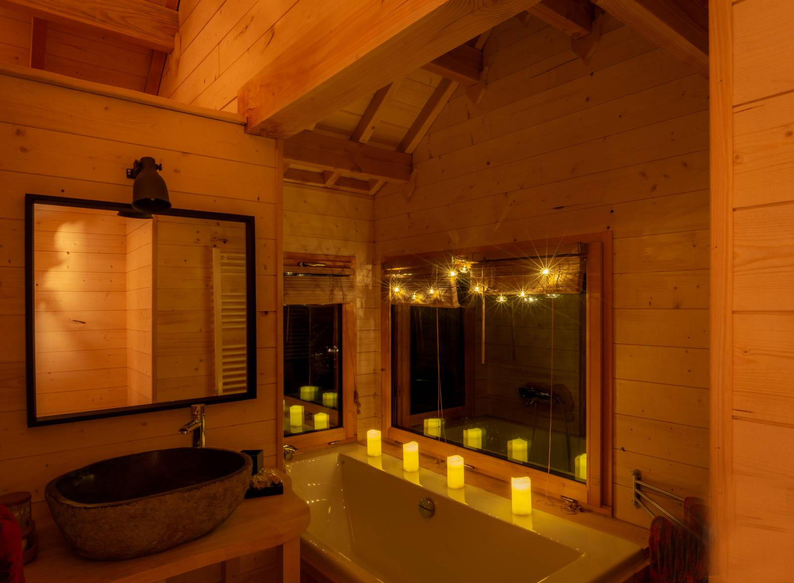 La cabane « Buzet » de 20m2 à l’intérieur et 15m2 de terrasse, imaginée pour 2 personnes, tout confort, une grande pièce à vivre, avec une kitchenette, un coin repas, et une salle de bain ouverte avec baignoire entouré de baies vitrés donnant sur la forêt et des toilettes séparées.