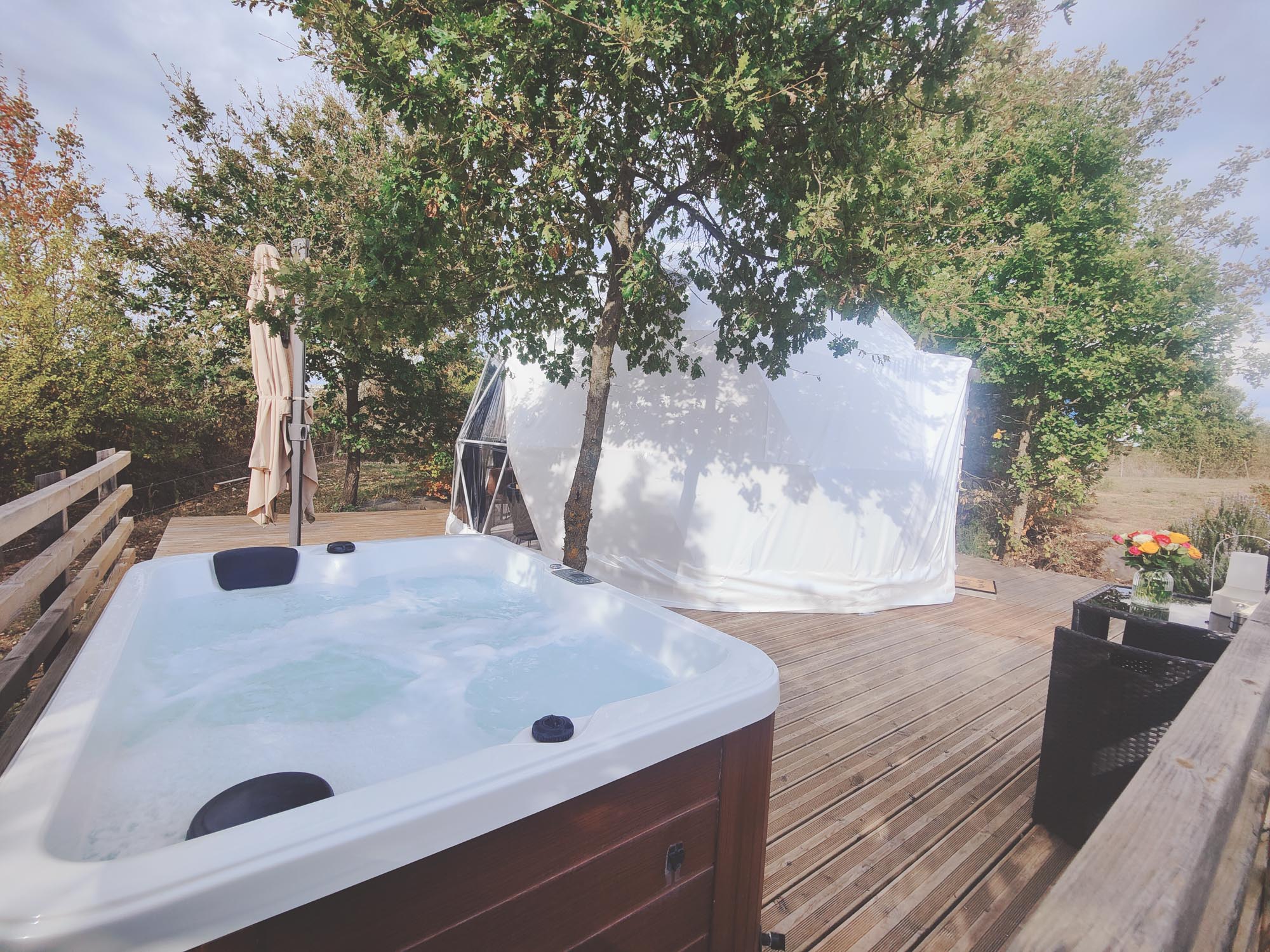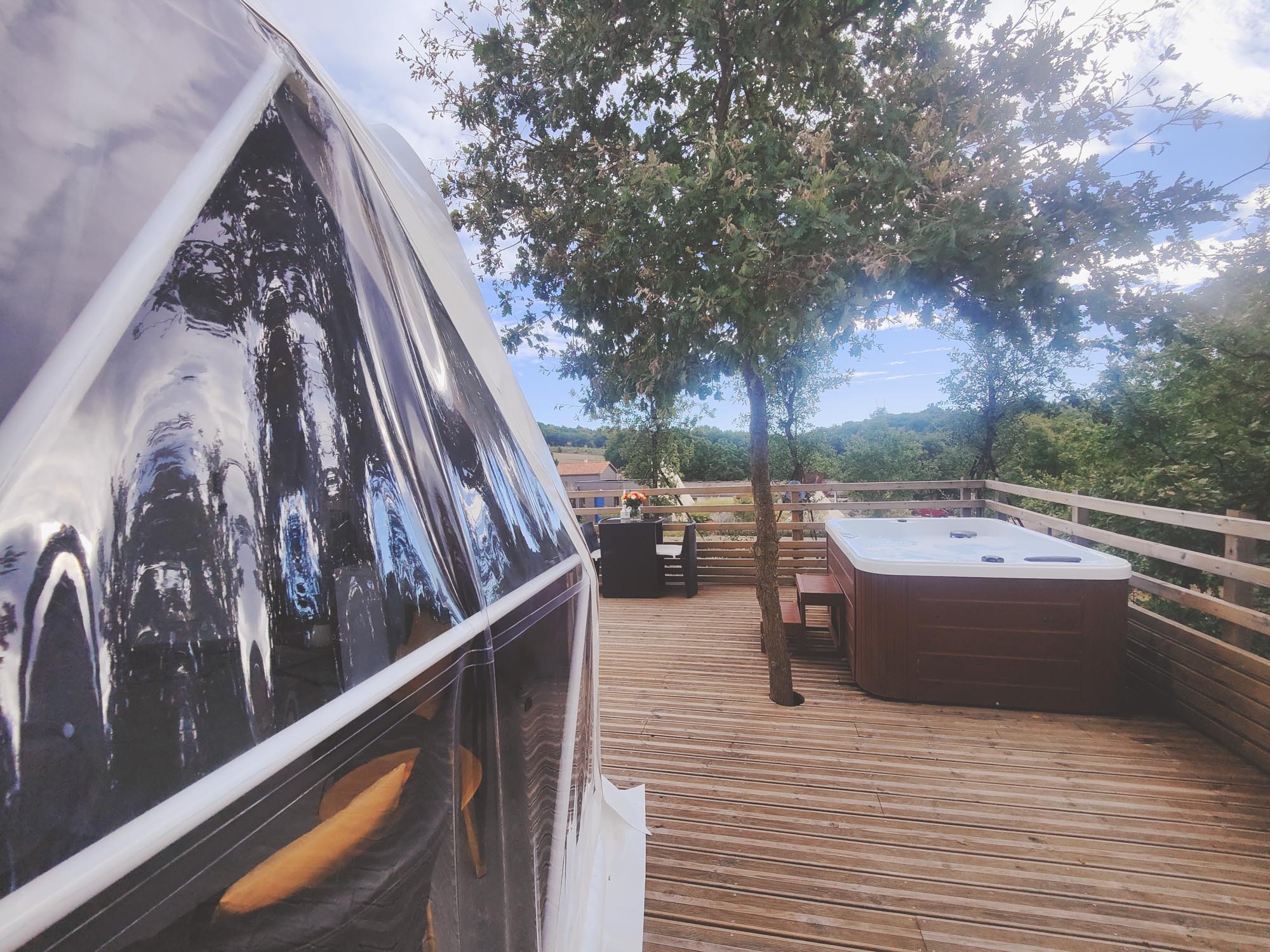 et pour finir, sa terrasse pour admirer les magnifiques couchers de soleil, ou la voie lactée bien installé dans votre spa privatif. Le dôme est parfaitement isolé, il est aussi équipé d’une climatisation réversible qui vous permet de réguler la température souhaitée toute l’année.